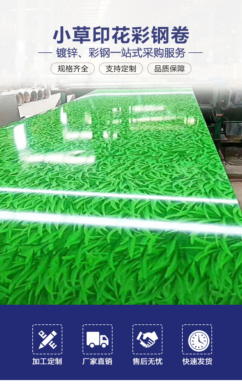 立體印花小草彩涂卷具有輕質(zhì)、美觀和良好的防腐蝕性能,又可直接加工,主要應(yīng)用于廣告業(yè)、建筑業(yè)、家電行業(yè)、電器行業(yè)、家具行業(yè)及運(yùn)輸業(yè)。